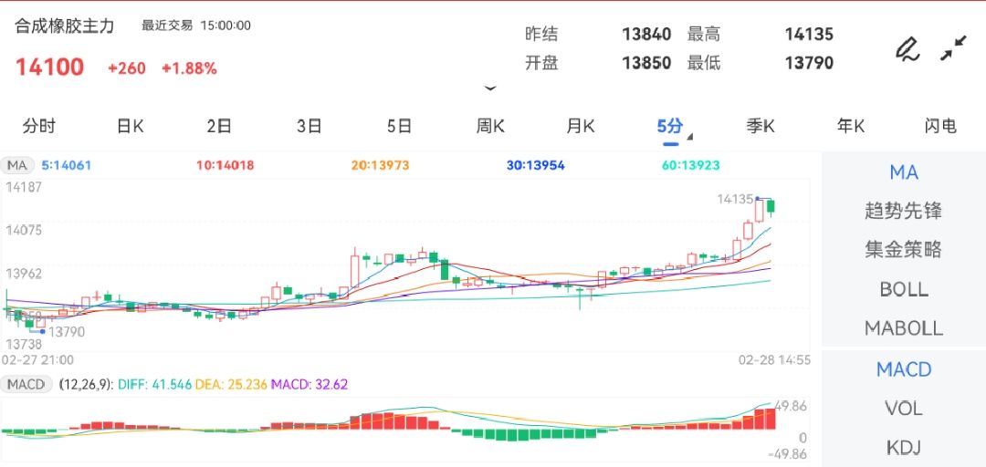 金投网APP行情中心多个方面数据显现,截止2025年2月28日下午15:00收盘,合成橡胶期货主力合约行情信息:最新价:14100,涨跌:260,涨跌幅:1.88%,成交量:111179,开盘价:13850,昨收价:13840,最高价:14135,最低价:13790。
