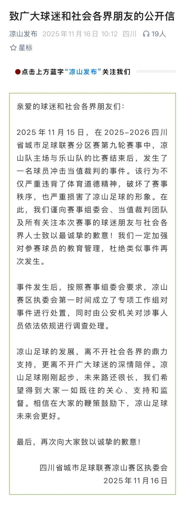 11月16日,四川省城市足球联赛凉山赛区执委会发布《致广阔球迷和社会各路朋友的公开信》,向咱们致以诚挚的抱歉。依照赛事组委会要求,凉山赛区执委会第一时间成立了专项工作组对事情进行处置,一起由公安机关对涉事人员依法依规做出具体的查询处理。