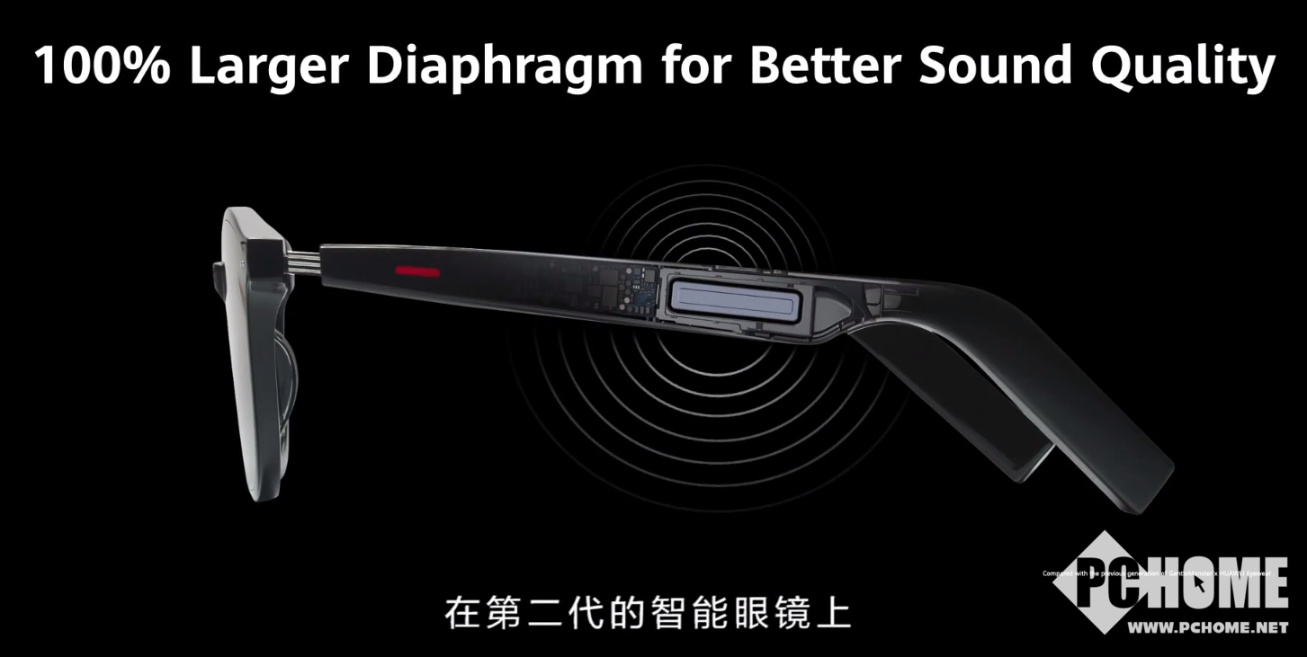 HUAWEI X GENTLE MONSTER Eyewear II智能眼镜采用128mm大振幅扬声器,让佩戴者可获得仿佛身临其境的音效体验,配合两条镜腿搭载的半开放式扬声器,带来更佳的立体声体验,更懂你对音乐的追求,陪你尽享美妙音乐时光。根据华为实验室数据,全新的逆声场声学系统,可降低漏音情况最大减少12dB,配合音量自适应技术,在享受音乐的同时保护你的隐私,所有声音只“响”你知道。